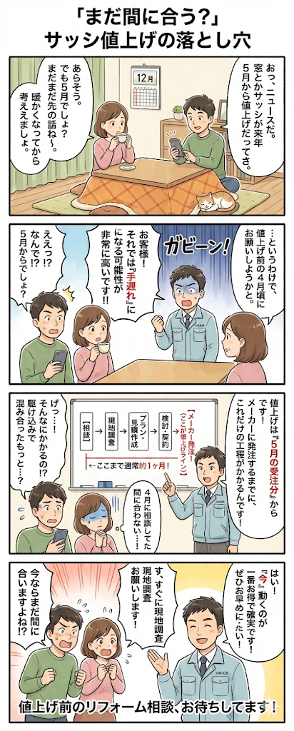 値上げ前の価格で確実に工事を行うためには、年明け早々など、余裕を持って動き出すのが賢い選択です。