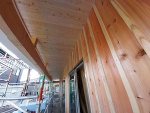 新発田の大工工務店が手刻みでつくる暖かい家』 胎内市並槻 S様邸 工事進捗 土縁部分の杉板押縁仕上げの外壁が完成しました。 内部の大工工事も大詰めを迎えています。